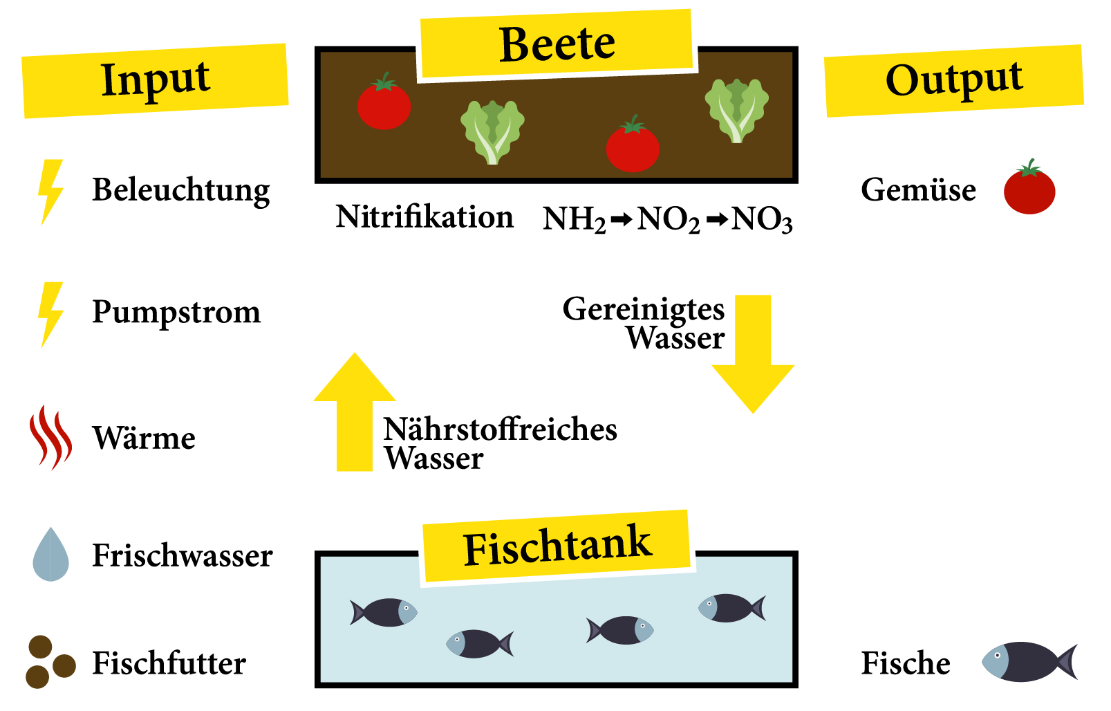 Viele unserer Lebensmittel, wie z.B. Tomaten werden in großen Gewächshäusern mit der Methode der Hydroponik angebaut. Dazu werden große Mengen an Kunstdünger benutzt, dessen Herstellung äußerst energieintensiv ist. Die Zucht von Fischen in Aquakultur schont zwar die Bestände der wildlebenden Fische, verursacht allerdings auch viel Abwasser, was zu einer Überdüngung von Gewässern führen kann. Es liegt also nahe, diese beiden Systeme zusammenzuschalten. Das nährstoffreiche Wasser aus einer Fischzucht wird so gereinigt und der Fischkot als Dünger für Pflanzen genutzt. So können der Einsatz von Wasser und Dünger reduziert werden. Setzt man diese Technik ein um in der Stadt oder im stadtnahen Raum zu produzieren, können auch lange Transportwege gespart werden.